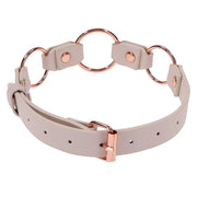 Stay decked in only the finest luxury BDSM wear with the Peaches ‘N CreaMe Ring Day Collar. Stylish and seductive, this bold accessory turns heads and sparks curiosity, hinting at your kink to those in the know. Crafted from smooth, comfortable faux leather, it features three rose gold rings that gleam with every move. Pair it with your favourite leash, a teasing set of clamps, or wear it solo to show you’re ripe for the taking.