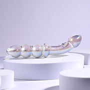 Introducing the Jewels collection, destined to be a favourite in your sex toy drawer. Jewels Double is a treasure trove of pleasure possibilities. One end features a curved and textured shaft with a tapered head for vibrant G-Spot and P-Spot stimulation. Flip the toy over and experience a row of chunky beads that are perfect for vaginal or anal play. Made of body-safe borosilicate glass, this Multi Play toy shimmers with a rainbow crystal iridescent finish and the iconic Rabbit Head Design adorns the shaft. Enjoy temperature play by immersing the toy in warm or cool water before use.
