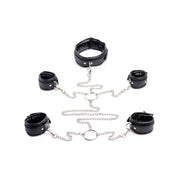 Limit your slaves mobility and remind them of your total control with an attractive and comfortable shackle set. The leather-like collar and 4 cuffs feature internal padding, adjustability, and locking buckles. All five accessories are connected via their D-rings and swiveling clasps to a series of chains to create a full-body restraint. Privately appreciate or show off your plaything in beautiful bondage when you keep them on their feet or force them on all fours.